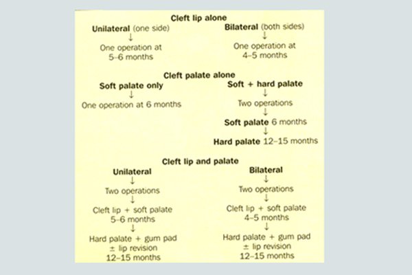 Surgical treatment called palatoplasty and Cheiloplasty are carried out on babies from the age of 3 month to 12 months [ Uk ], 6-14 month [ USA ], EU 3-17 Months and India 3-18 Months.
